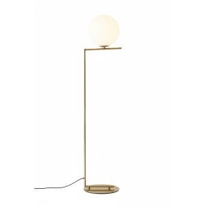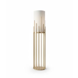 Esta luminaria de pie se compone de tres ejes de hierro en acabado dorado que elevan esferas de vidrio a distintas alturas. Su diseño busca emular una constelación lumínica, proporcionando una luz ambiental suave y texturizada gracias al acabado de sus difusores. Una pieza que combina la rigidez estructural del metal con la delicadeza geométrica del cristal, ideal para jerarquizar salones y espacios de transición.