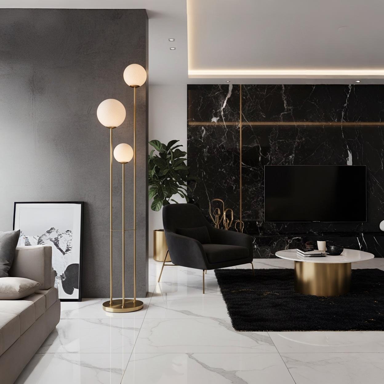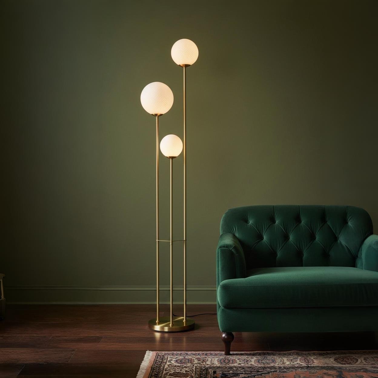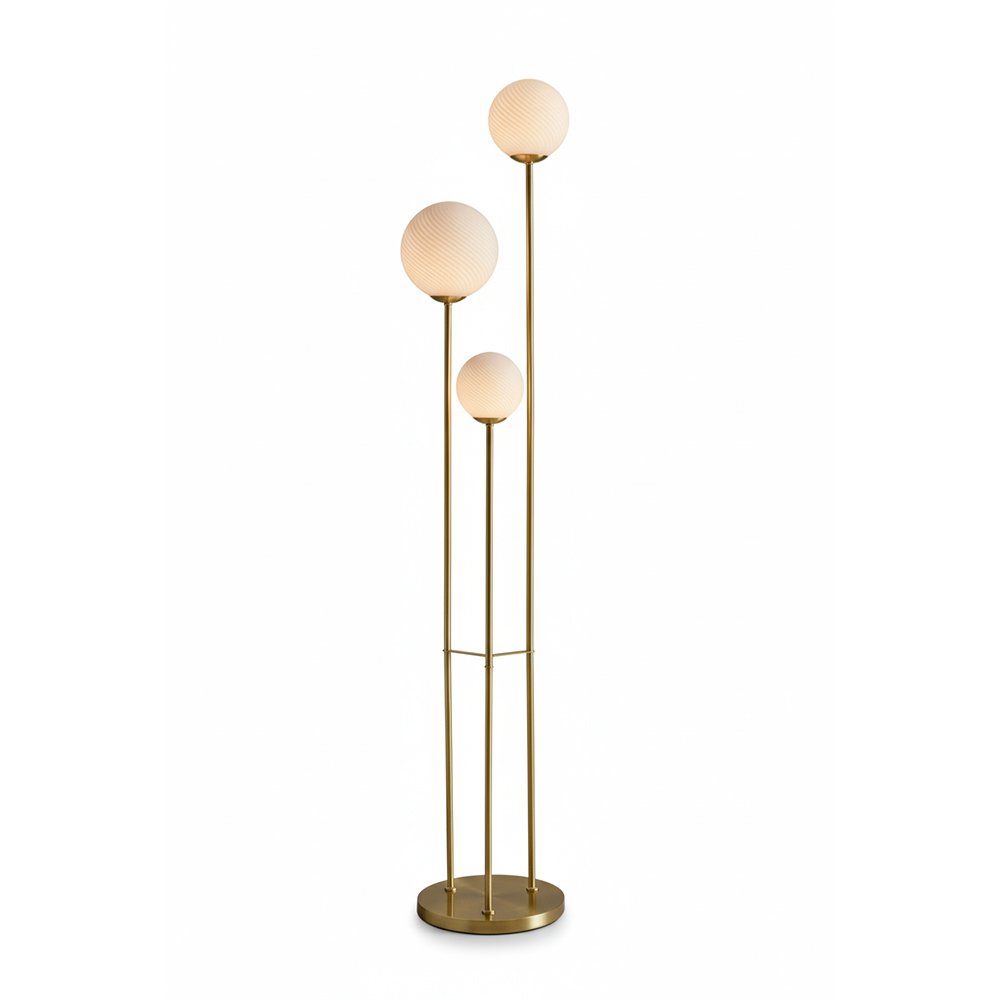 Esta luminaria de pie se compone de tres ejes de hierro en acabado dorado que elevan esferas de vidrio a distintas alturas. Su diseño busca emular una constelación lumínica, proporcionando una luz ambiental suave y texturizada gracias al acabado de sus difusores. Una pieza que combina la rigidez estructural del metal con la delicadeza geométrica del cristal, ideal para jerarquizar salones y espacios de transición.